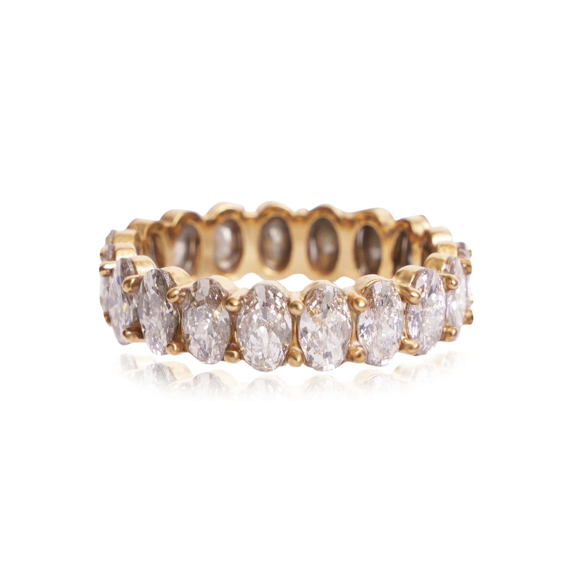 Our super-versatile Haven ring features the classic eternity setting, glistening with oval cut stones prong set around it for a luxurious sparkle seen from all angles. Mix and match this slim stack ring with statement pieces, or wear it solo for an understated style.